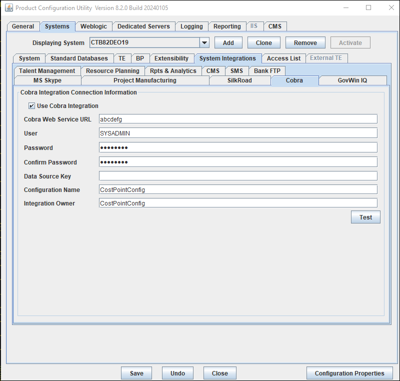 - If you currently download the Cobra information without the automated integration with Cobra Web Services, then you have not set up the integration in Product Configuration and will not see the connection for Cobra in the Manage System Integration Accounts application. You MUST enable/configure this connection in the Costpoint Configuration Utility. Note that it does not have to be valid values. (Please do NOT click the Test button to validate.)