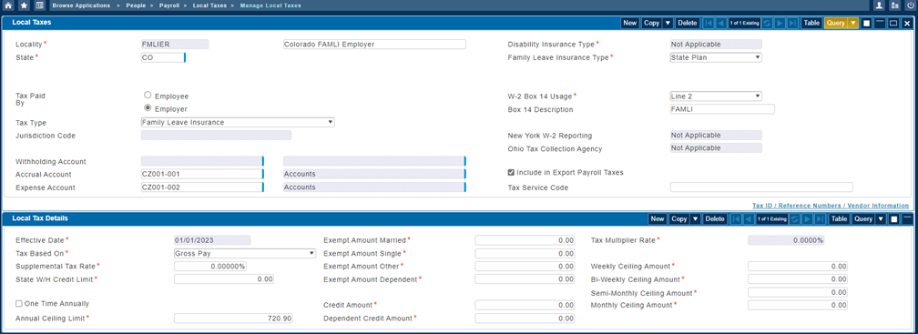Local Tax code to represent the employer-paid Colorado FAMLI tax and enter the following, and then set other local values as needed: