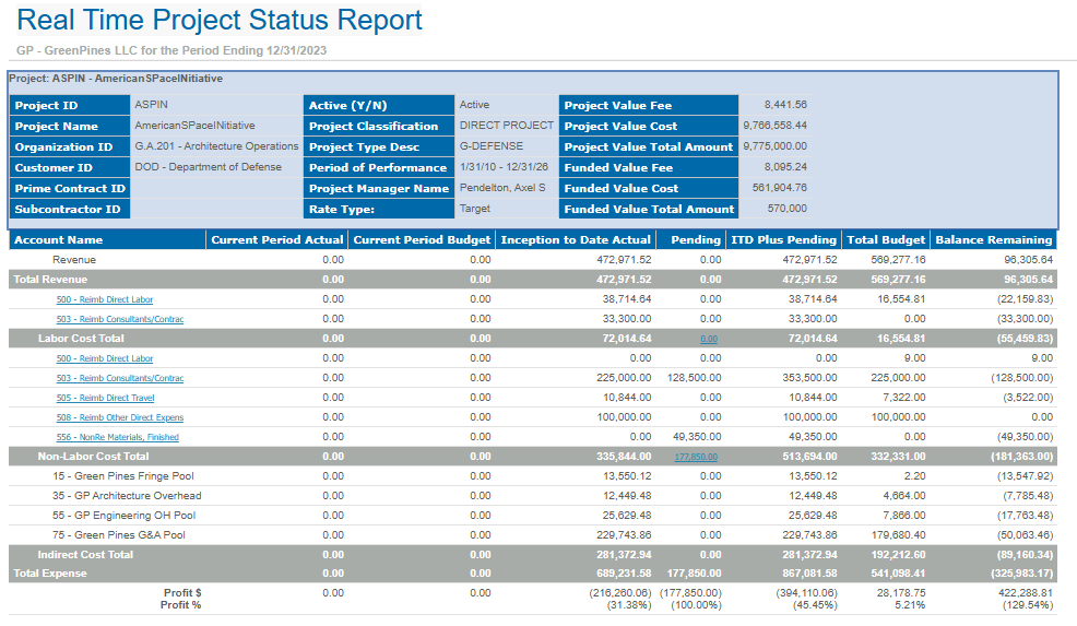 Sample Report This is a sample of the Real Time Project Status report. Parent Topic: Real Time Project Status Report HomeReports & AnalyticsWelcome to Costpoint Business IntelligencePlanningPlanning ReportsReal Time Project Status ReportSample Report