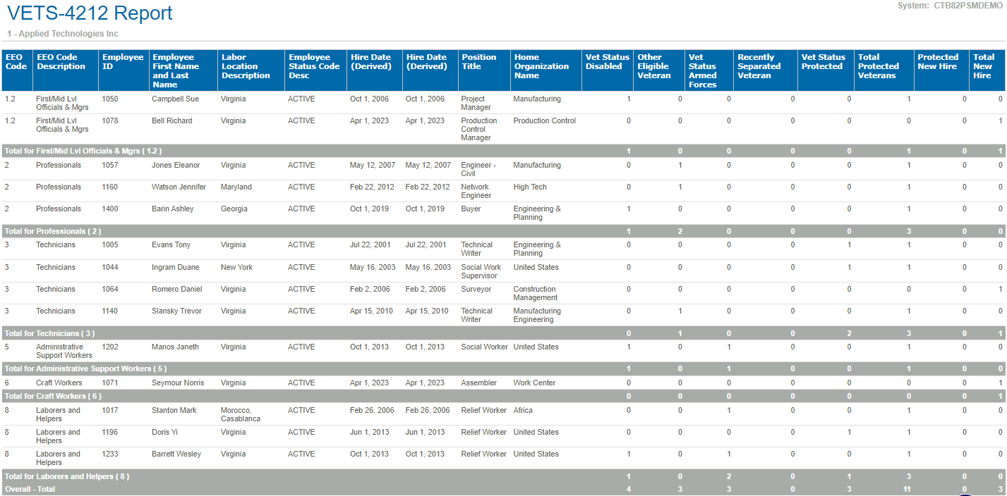 Sample Report A sample of the VETS-4212 report. Parent Topic: VETS-4212 Report HomeReports & AnalyticsWelcome to Costpoint Business IntelligenceHuman ResourcesHuman Resources ReportsVETS-4212 ReportSample Report
