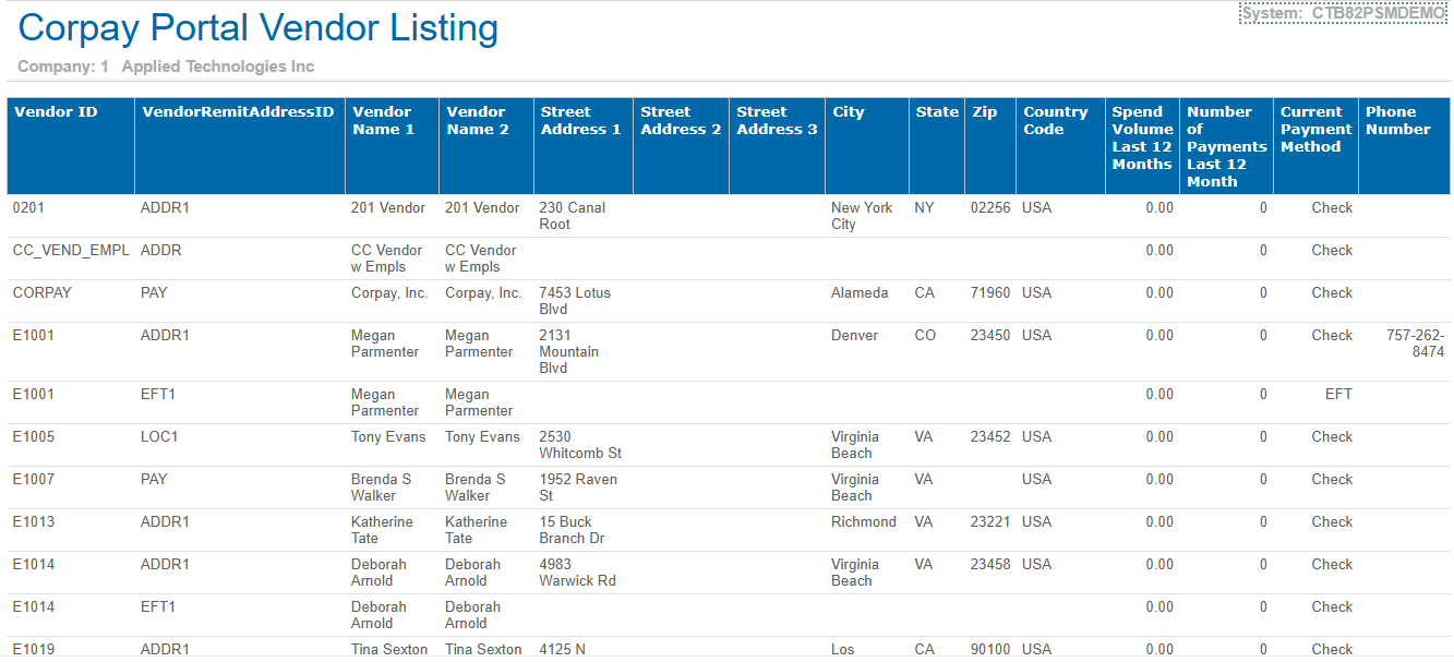 Sample Report This is a sample of the Corpay Portal Vendor Listing report. Parent Topic: Corpay Portal Vendor Listing Report HomeReports & AnalyticsWelcome to Costpoint Business IntelligenceAccounts Payable Accounts Payable ReportsCorpay Portal Vendor Listing ReportSample Report