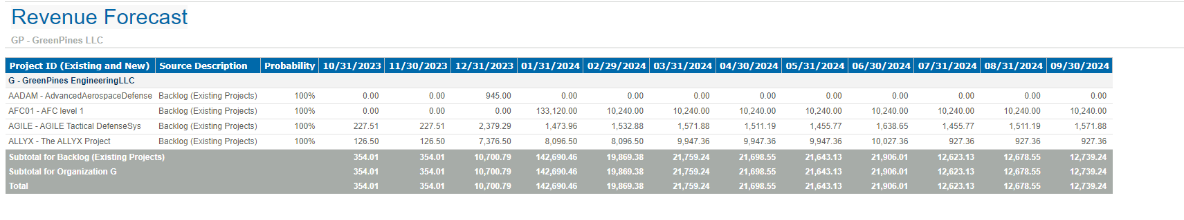 Sample Report This is a sample of the Revenue Forecast report. Parent Topic: Revenue Forecast Report HomeReports & AnalyticsWelcome to Costpoint Business IntelligencePlanningPlanning ReportsRevenue Forecast ReportSample Report