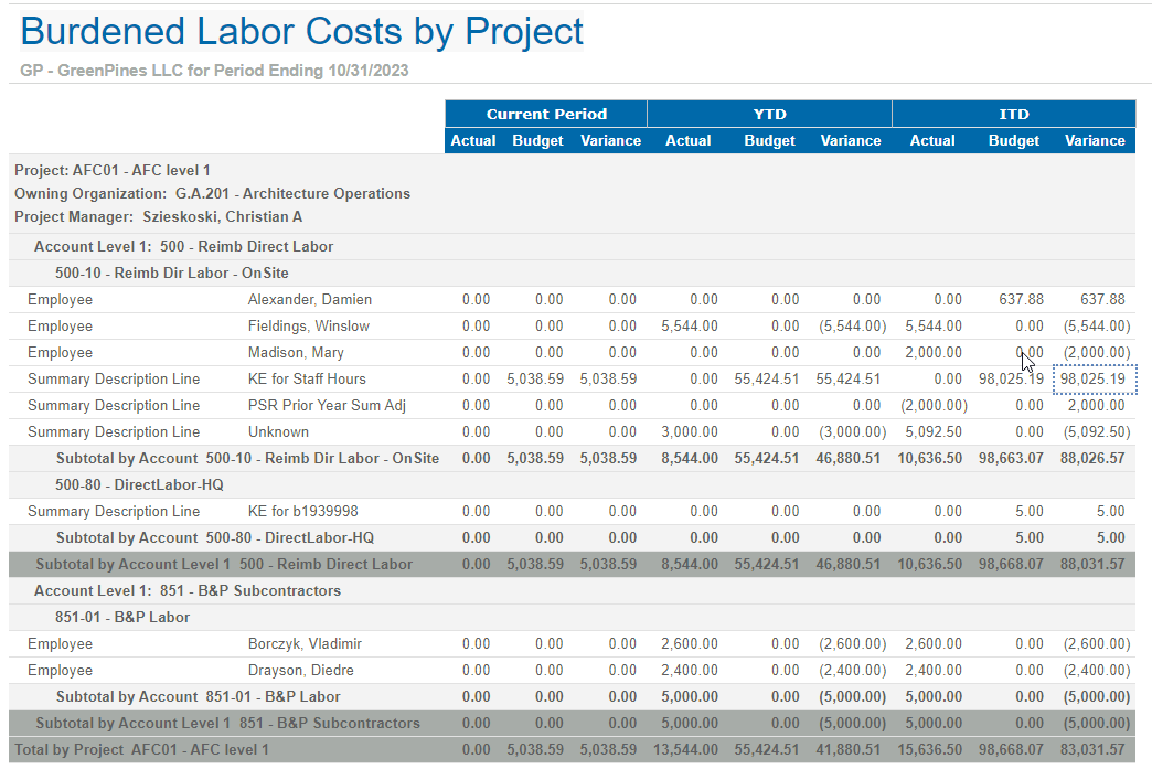 Sample Report This is a sample of the Burdened Labor Costs by Project report. Parent Topic: Burdened Labor Costs by Project HomeReports & AnalyticsWelcome to Costpoint Business IntelligencePlanningPlanning ReportsBurdened Labor Costs by ProjectSample Report