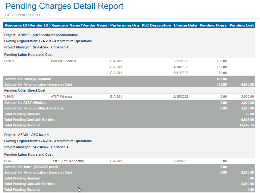 Sample Report This is an example of the Pending Charges Detail report. Parent Topic: Pending Charges Detail Report HomeReports & AnalyticsWelcome to Costpoint Business IntelligencePlanningPlanning ReportsPending Charges Detail ReportSample Report