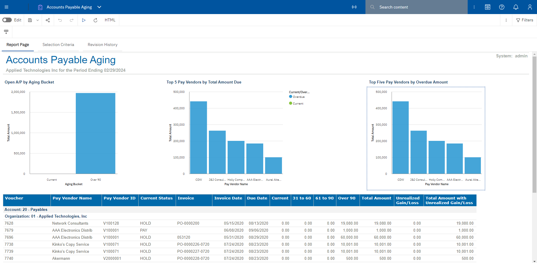 Sample Report View an example of the Accounts Payable Aging report. Parent Topic: Accounts Payable Aging HomeReports & AnalyticsWelcome to Costpoint Business IntelligenceAccounts Payable Accounts Payable ReportsAccounts Payable AgingSample Report